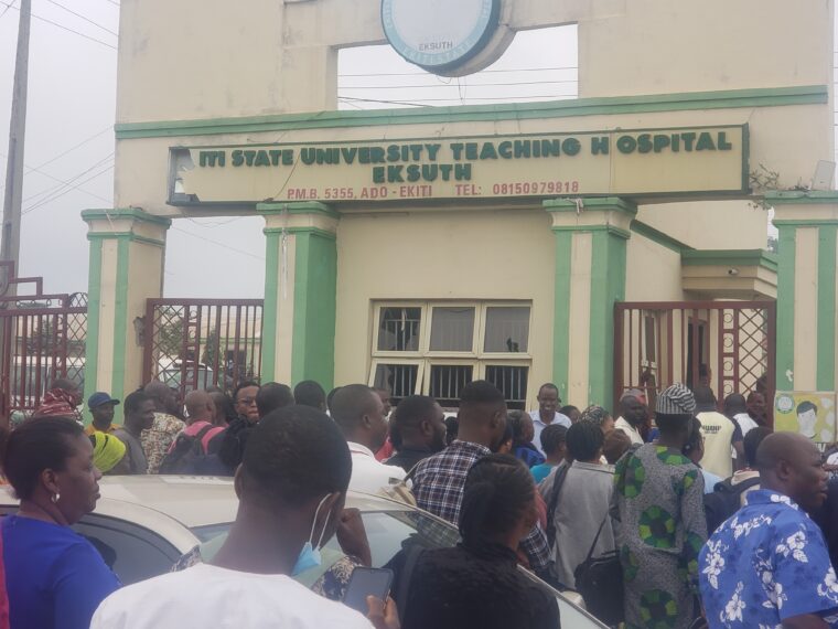 PATIENTS GROAN AS HEALTH WORKERS SHUTDOWN EKSUTHPatients at the Ekiti State University Teaching Hospital, Ado Ekiti were on Monday left unattended to as members of the Joint Health Workers Union shut down the institution.The aggrieved workers locked the major entrances to the hospital, thus preventing all other workers from gaining access to the hospital.The action of the workers is sequel to the alleged failure of government to attend to their demands as confirmed by JOHESU Chairperson, Comrade Omotola Farotimi.She said:It’s a long time matter which government has failed to resolve over the years.“It includes non remittance of our coperative deductions, special levies, union dues and implementation of minimum wage.“We are being owed deductions runing to two years and we are getting tired.“This development has left to brain drain, as many of our best hands have left for greener pastures.“We signed an MOU with government that every approval for staff of Federal Teaching Hospital by government would be given to us but we are yet to get minimum wage which has been approved since 2019.“The last board approved it but the management failed to pay.“It is disheartening that despite our sacrifices we have been treated so badly by successive governments.Mrs Farotimi said the demonstration would continue until government do the needful.Some relatives of patients who spoke described the development as painful as patients were the ones bearing the brunt.