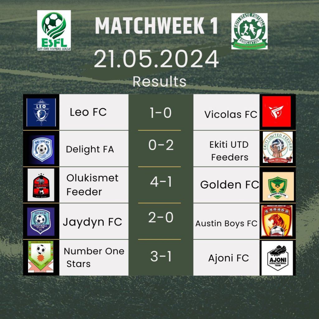 May 21, 2024 BRAM Match Week one results of The Ekiti State League 2024. Match Week one results of The Ekiti State League 2024. The league opener was between ABUAD vs Premier FC. #ESFL24 Share this: Share on X (Opens in new window) X Share on Facebook (Opens in new window) Facebook Share on WhatsApp (Opens in new window) WhatsApp Like Loading... Related