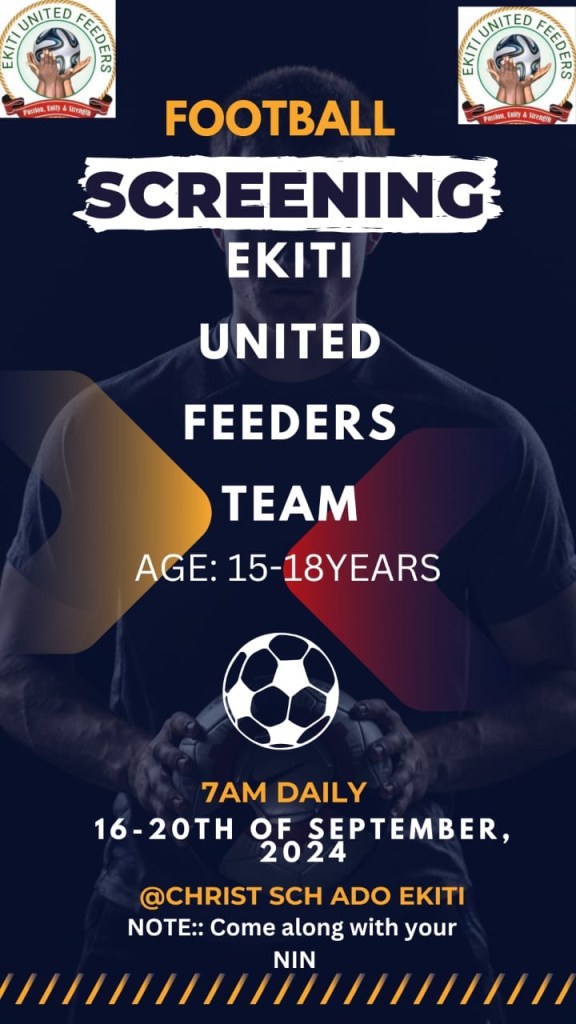 The Team Manager, Olushola Babatola in a statement said trail for new set of players that will form the nucleus of the rebranded Ekiti United Feeders Team will begin on Monday September 16 and end on Friday September 20 at the Christ School Football field in Ado.